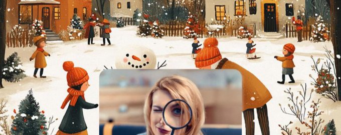 Unten sehen Sie das Bild eines schneebedeckten Platzes, auf dem Menschen spazieren gehen. Jemand spielt mit Schneebällen, jemand baut einen Schneemann oder bewundert einfach die Winterlandschaft.