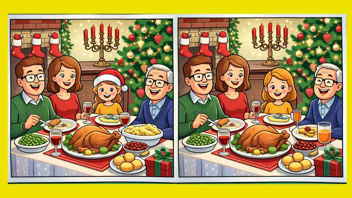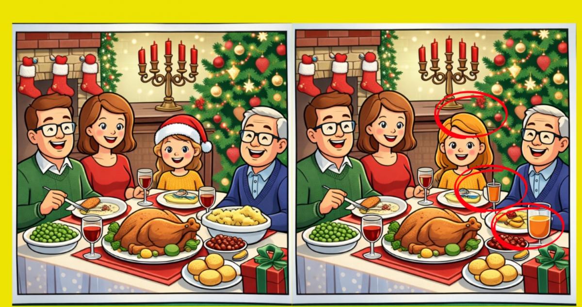 Sind Sie also bereit für die nächste Herausforderung? Schauen Sie sich zwei Bilder von einem weihnachtlichen Familienessen genau an. Sie mögen auf den ersten Blick gleich aussehen, aber es gibt 3 kleine Unterschiede, die sich darin verstecken. Denkst du, du kannst sie alle in 16 Sekunden finden? Probiere es aus und teste deine Sehschärfe!